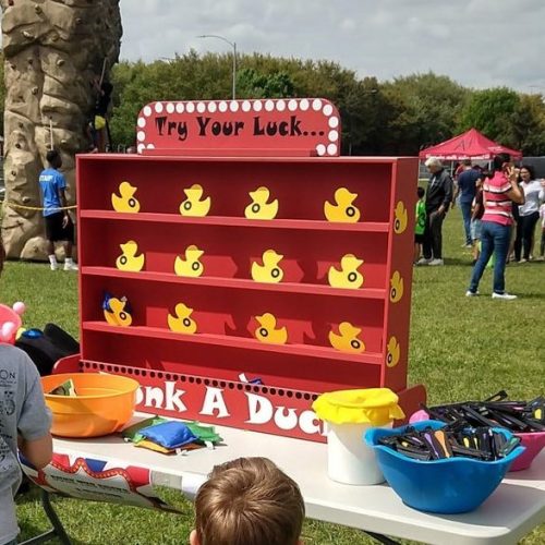 Dunk a Duck Shooting Gallery comes with NERF gun and 12 wooden “rubber ducks”.