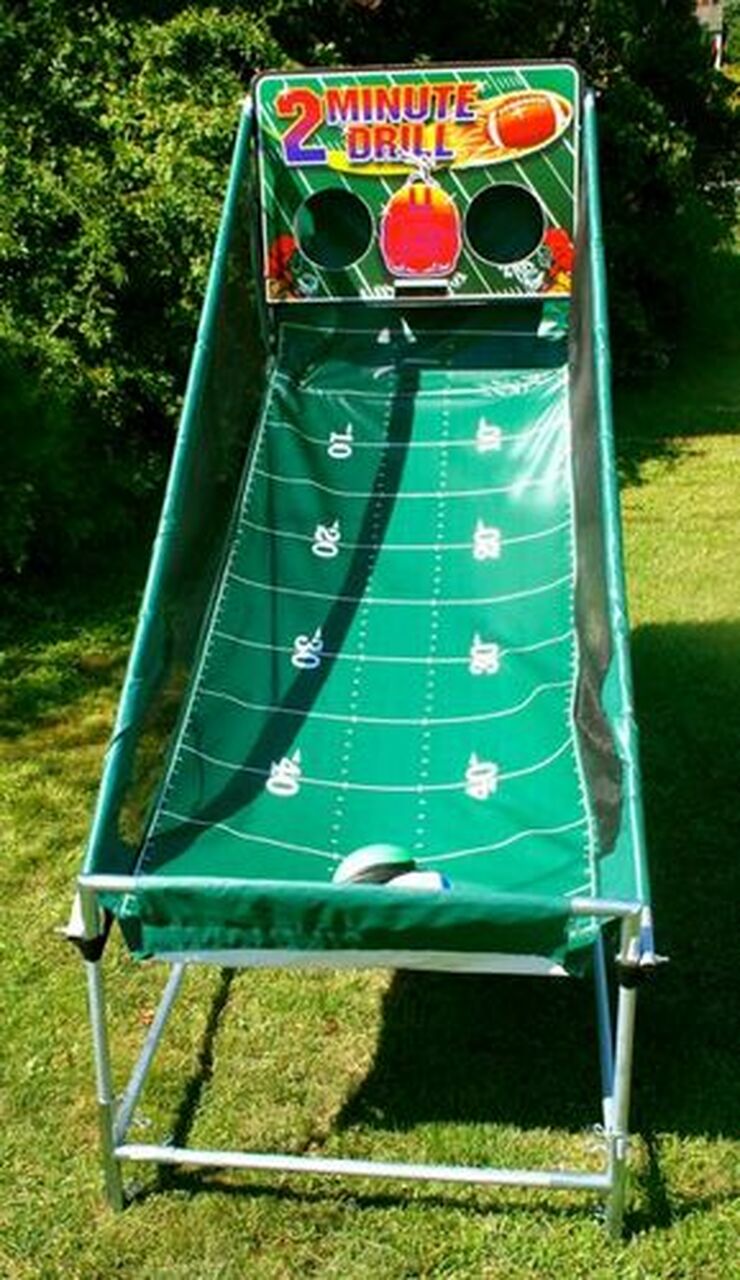 2 Minute Drill Electronic Football is a race against the clock that can be played by one person or by two in a 1 on 1 competition. The clock counts down the time, as the score is kept on the bright, LED scoreboard. Its heavy-duty vinyl ramp and rugged steel frame makes it ideal for rental use. Plus, the fact that it folds in half makes it easy to set-up and take down, simple to store, and ideal for rental use.