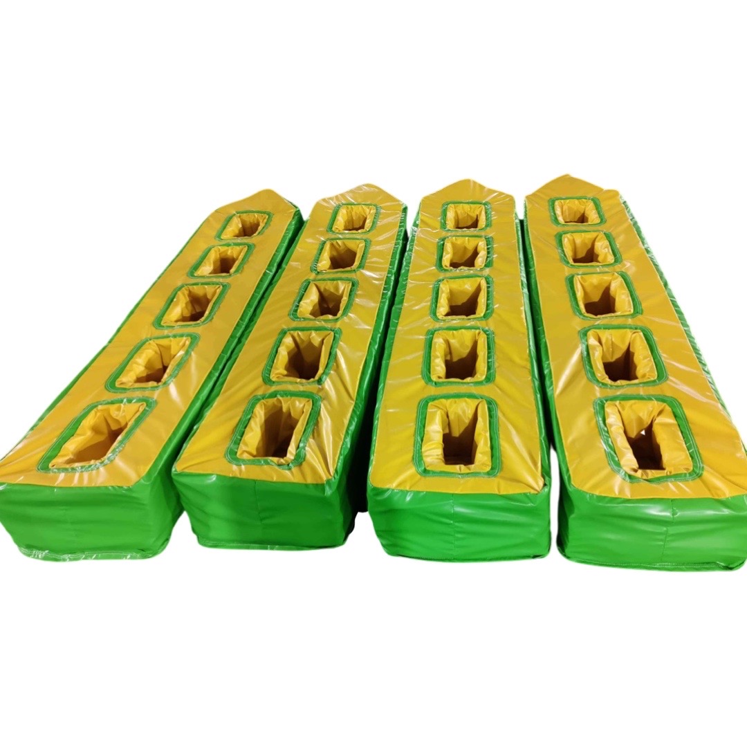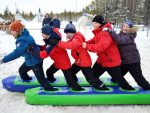 “Giant skiing” is a great game to organize team competitions. They are designed for five participants, although there may be fewer. The main task is to move the skis as quickly and synchronously as possible in order to reach the finish line before the rivals.