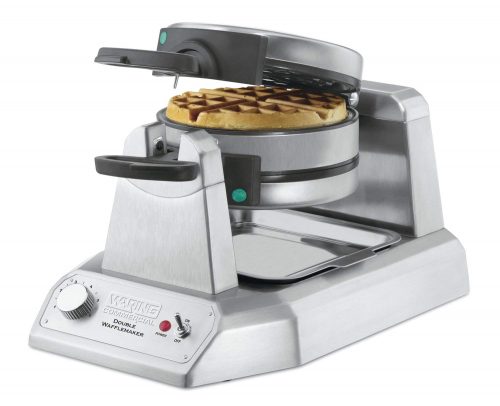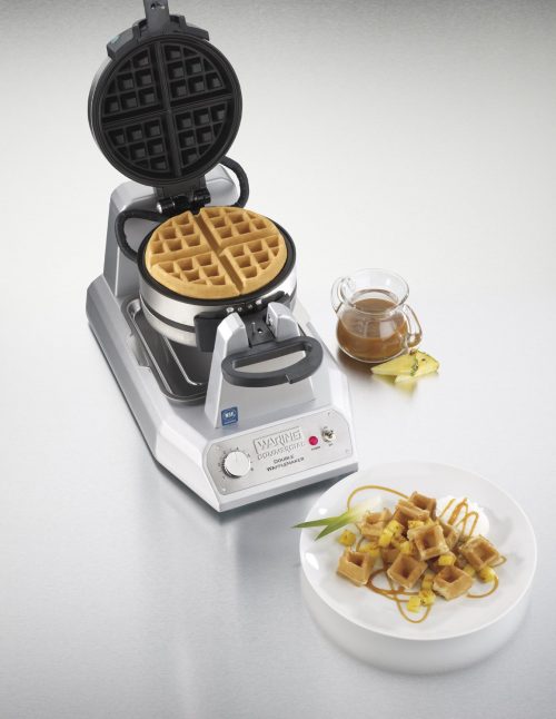 - Double vertical Belgian waffle maker features heavy-duty commercial construction